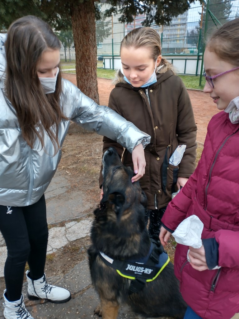 Všetkých milo prekvapila práve Vaneska. Svoj projekt o jej miláčikovi - belgickom ovčiakovi menom Bony poňala netradične. Na hodinu biológie priviedla na školské ihrisko svojho 4-nohého kamaráta, ktorého úplne sama  trénuje už 6 a pol roka. Na úvod ho zoznámila   so svojimi spolužiakmi. Deti mali možnosť pohladkať psíka a nadviazať s ním priateľský kontakt..