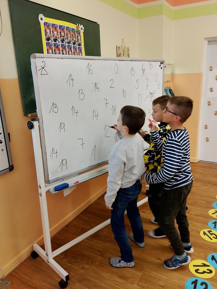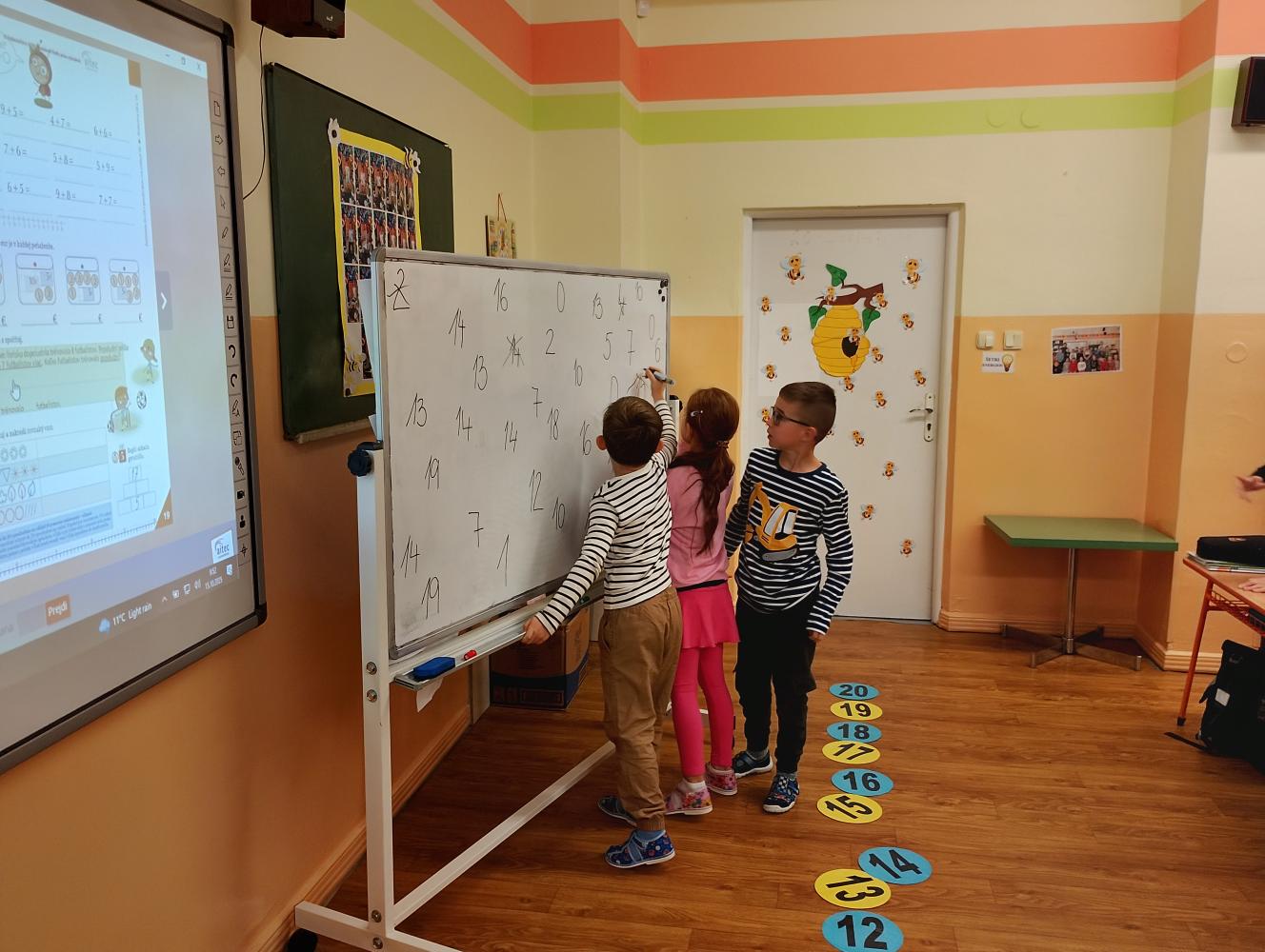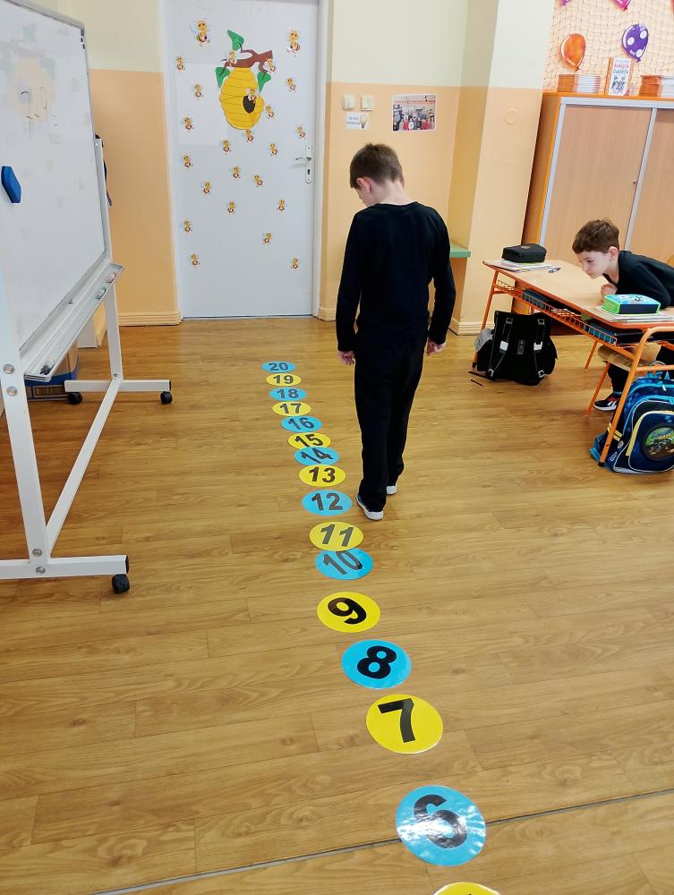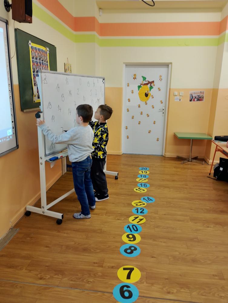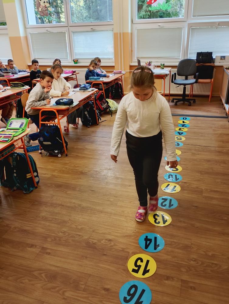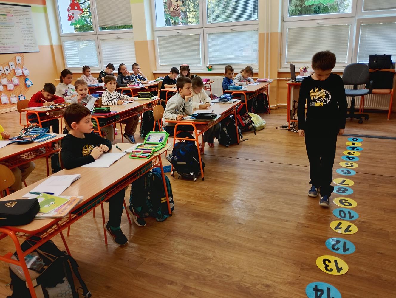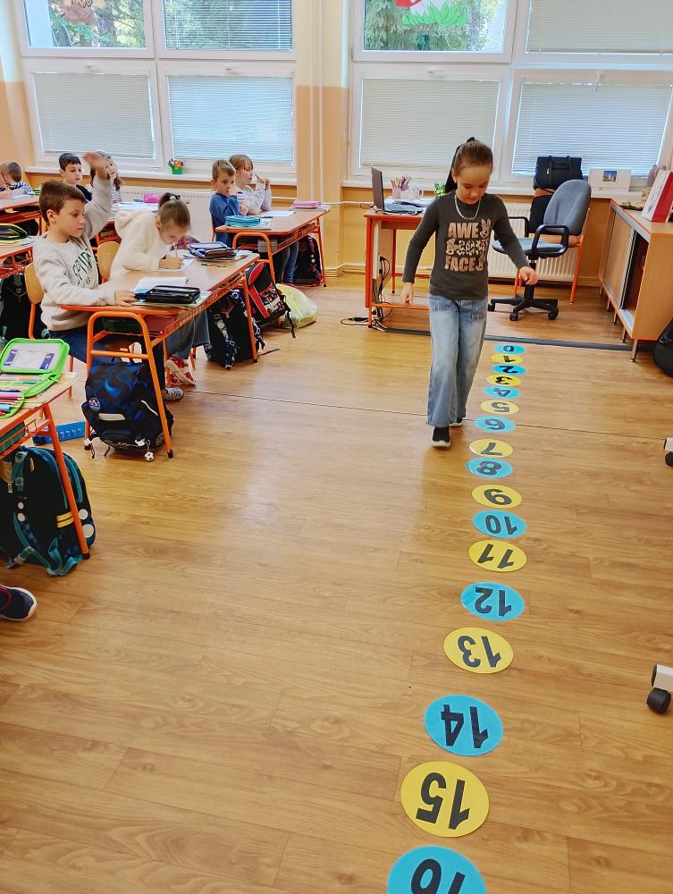 V druhej časti hodiny žiaci hľadali výsledky aj na číselnom rade umiestnenom na zemi. Hravou formou si tak precvičili sčítanie a odčítanie do 20 s prechodom cez 10. Žiaci pracovali s nadšením, spolupracovali v tímoch a učenie prebiehalo aktívne a zábavne.