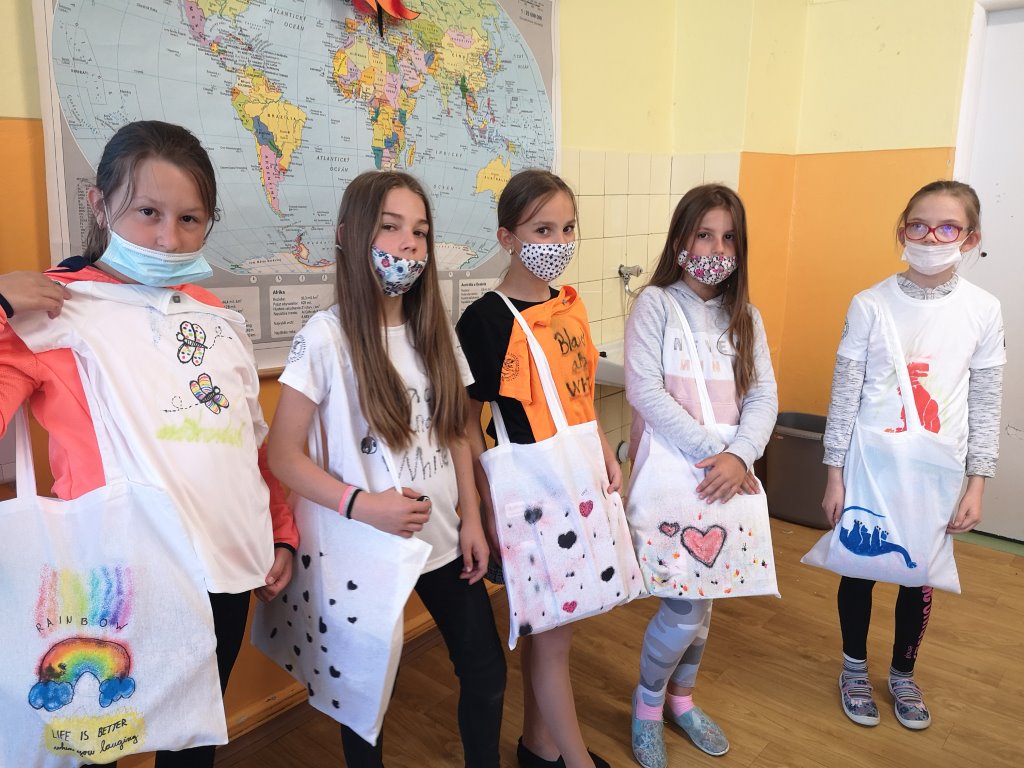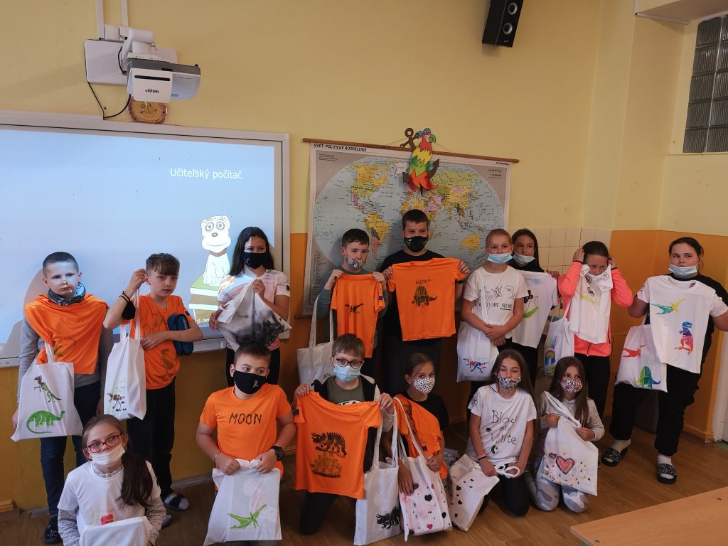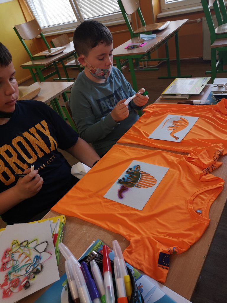 Posledný blok workshopu uzatvorili praktickými činnosťami: vytvorili si pomocou fúkacích fixiek, šablón a vlastnej fantázie Eko tašku a Kreatívne tričko s prírodným motívom.