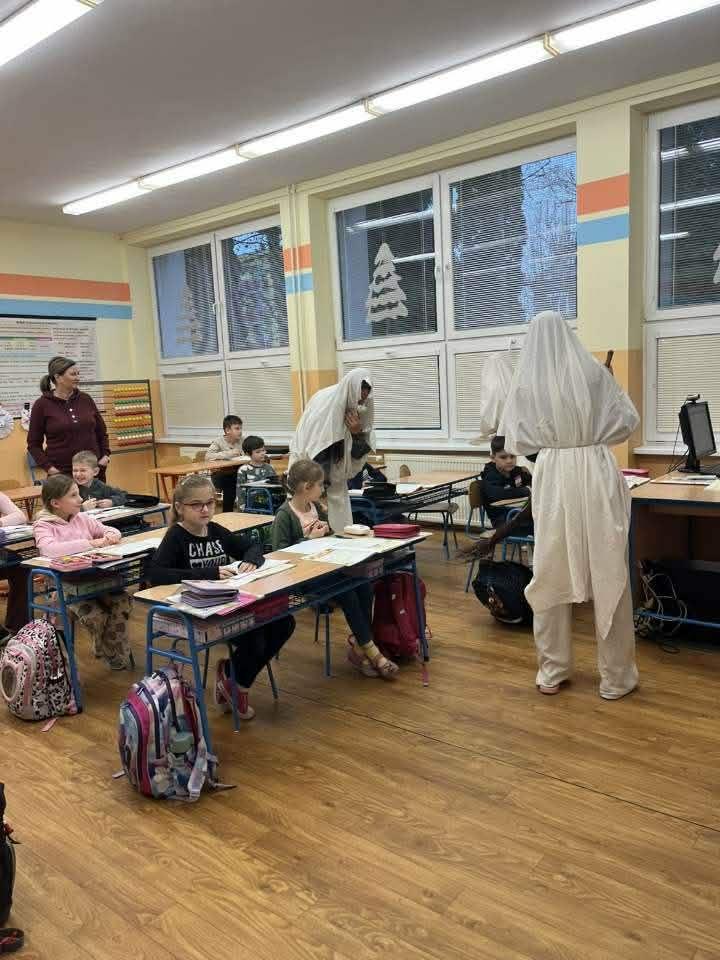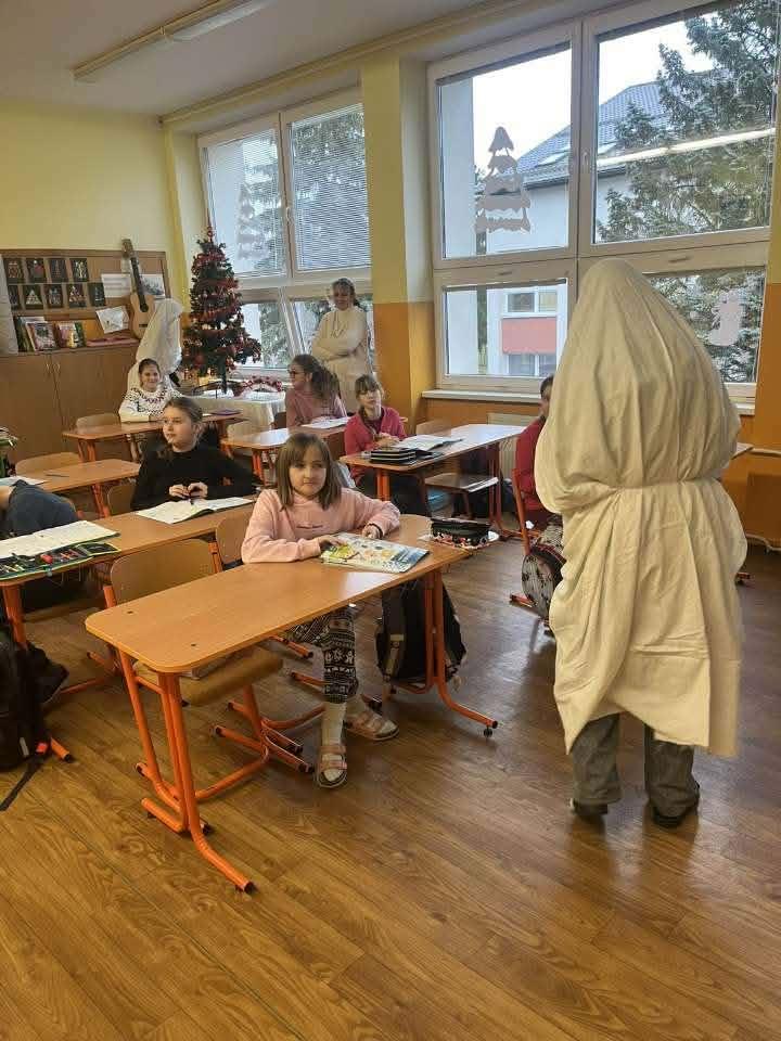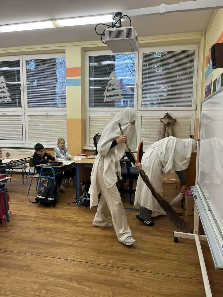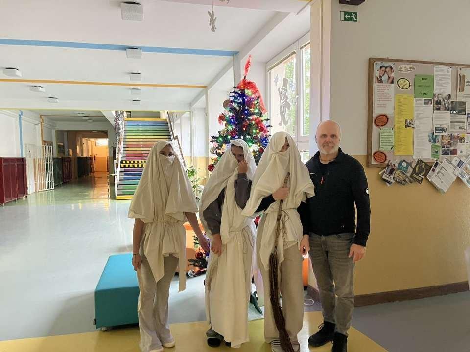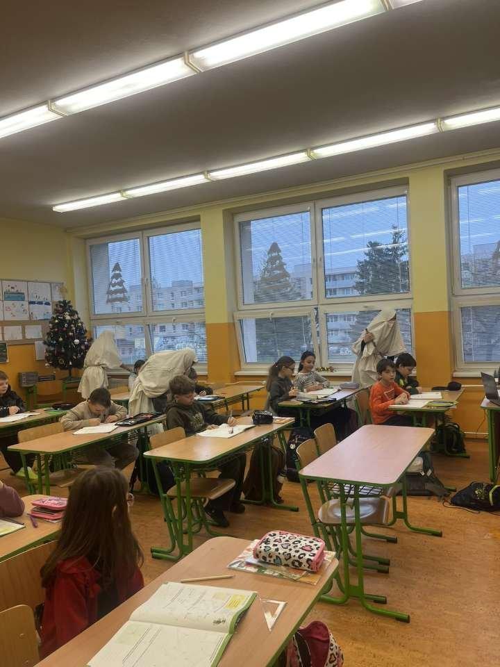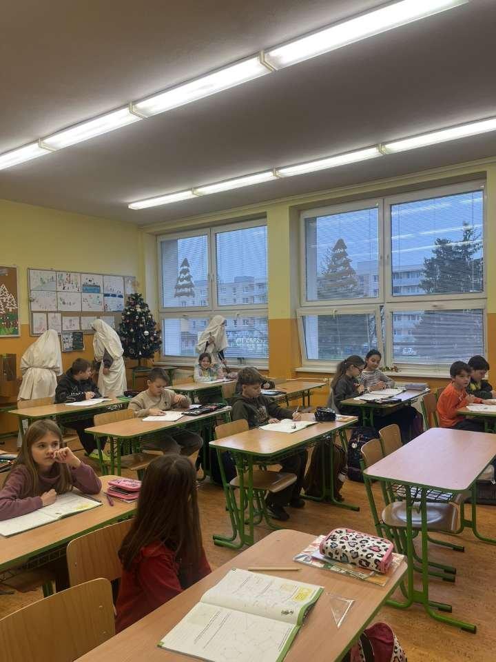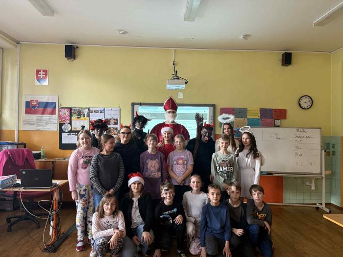 5. 12. 2025 k nám opäť, tak ako každý rok, zavítal Mikuláš. Priviedol so sebou troch čertov a dvoch anjelov. Bolo to skutočne zaujímavé, ako deti hľadali slová, aby zaujali Mikuláša a anjelov a aby ich čerti neodniesli preč. Či malí žiaci alebo veľkí, každý sa snažil niečo zaspievať, aby bol Mikuláš spokojný. A veruže aj bol. Žiakom rozdal cukríky a pobral sa zas ďalej, aby o rok opäť privítal medzi nás. Ďakujeme Mikuláš.