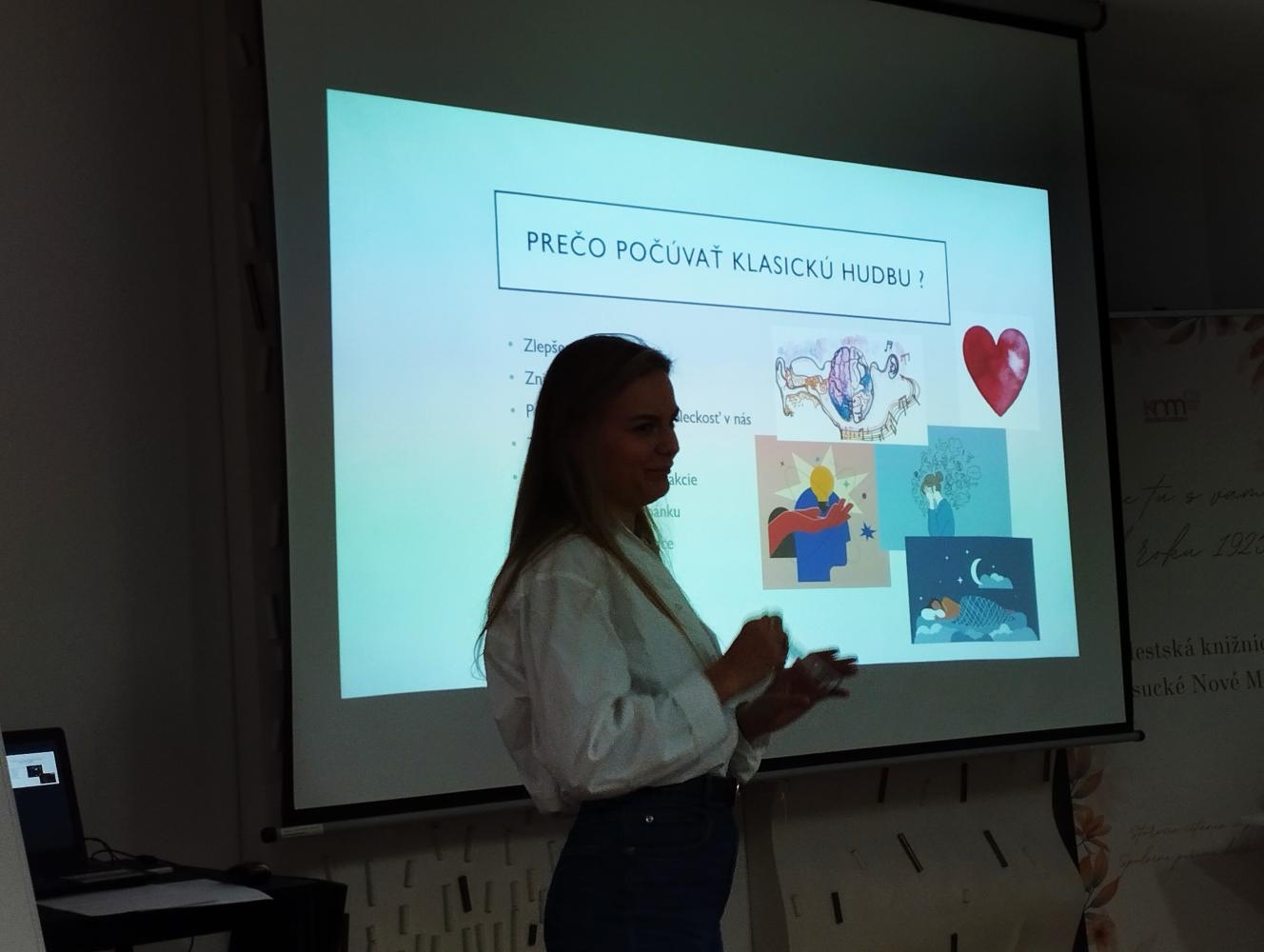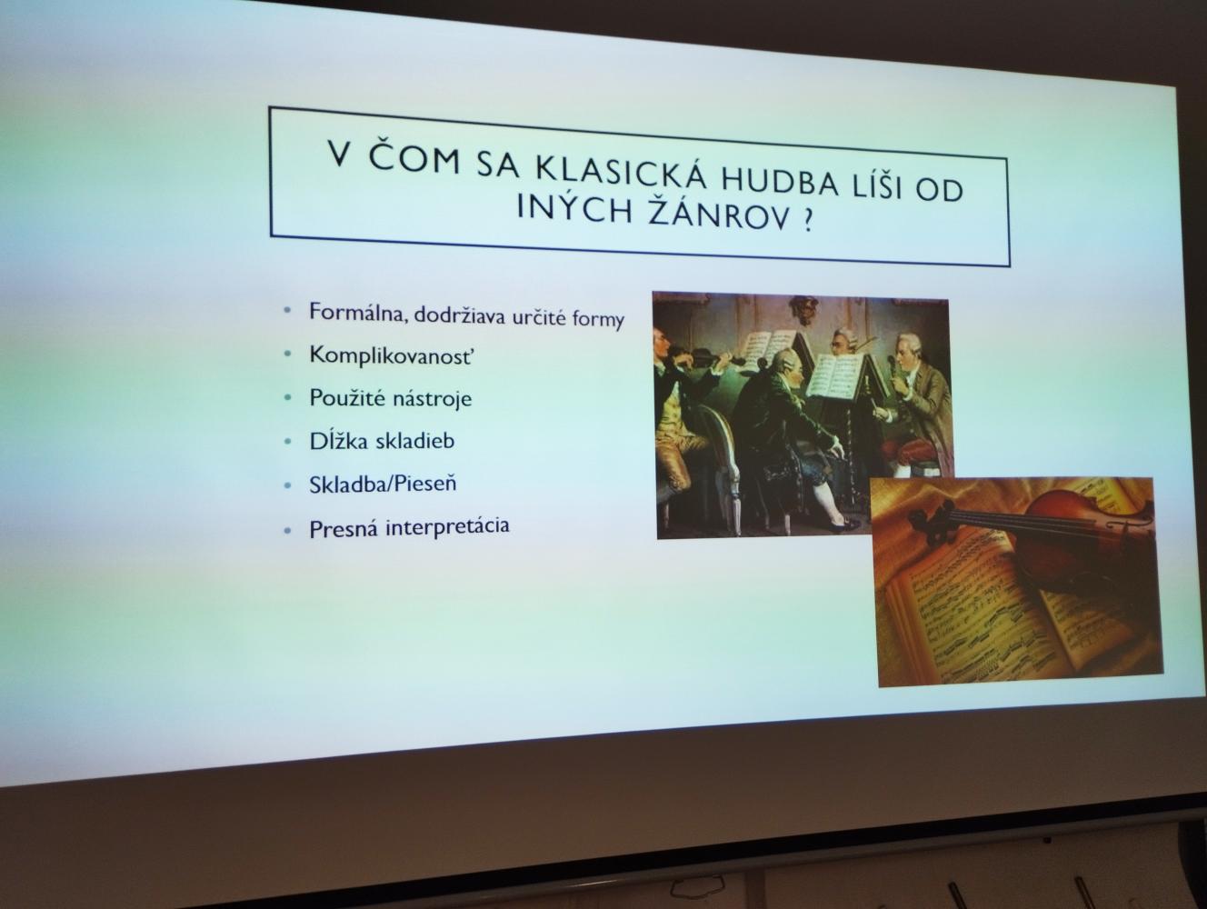 Pri tejto príležitosti sme si vypočuli prezentáciu mladej pani lektorky a učiteľky klavíra Silvie Fujákovej, ktorá bola prierezom dejín hudby, - obdobiami, ktoré sa učia aj na hudobnej výchove. Žiaci mali za úlohu dávať pozor a počúvať informácie spolu s hudobnými ukážkami tak, aby na konci mohli súťažiť v kvíze a čo najlepšie odpovedať. Víťazi boli odmenení drobnými cenami a všetci certifikátmi „Znalec vážnej hudby“.
